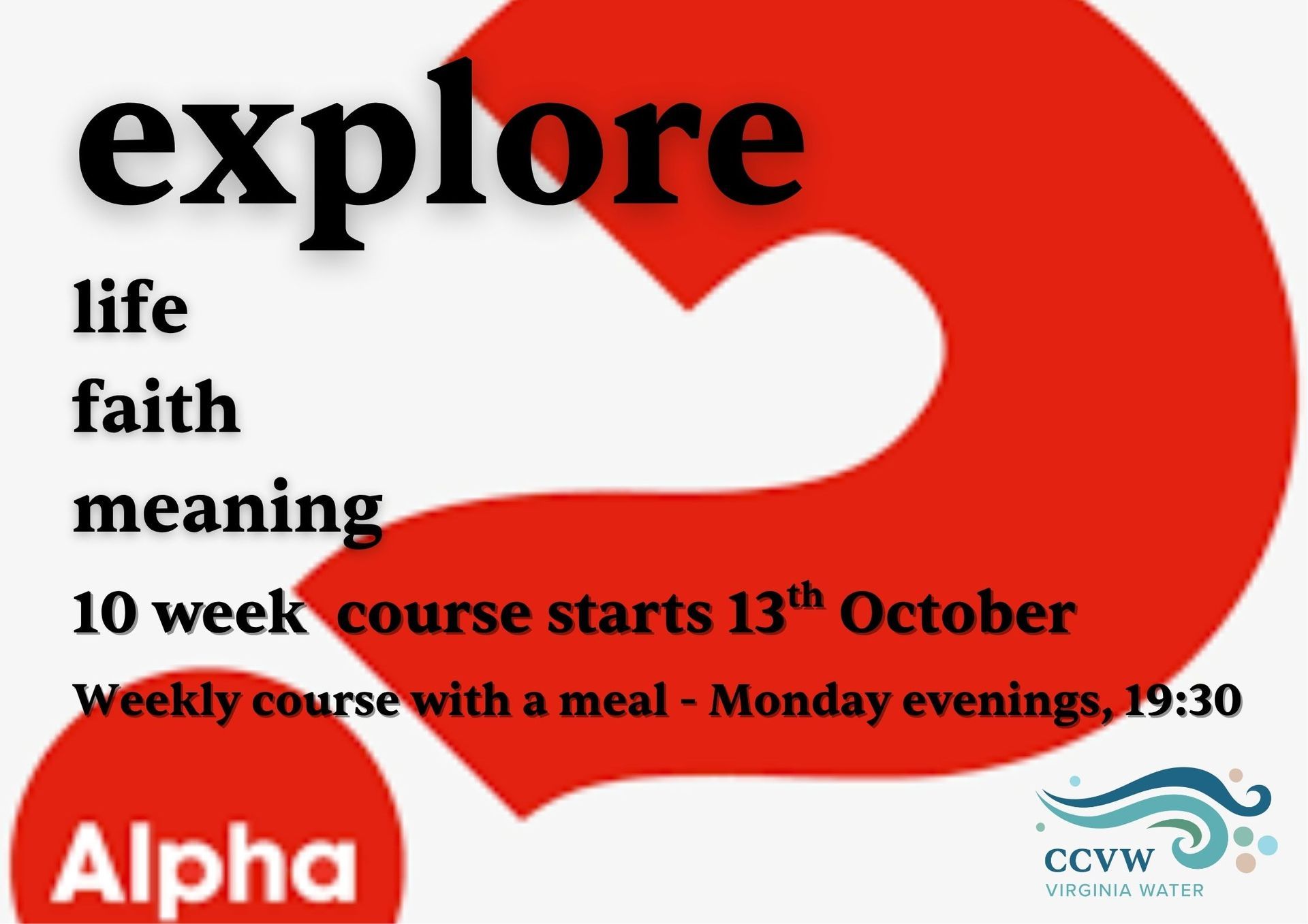 Discuss the big questions in a relaxed environment over a meal. It will run for 10 weeks starting on Monday 13th October at 19:30 at Christ Church Virginia Water.